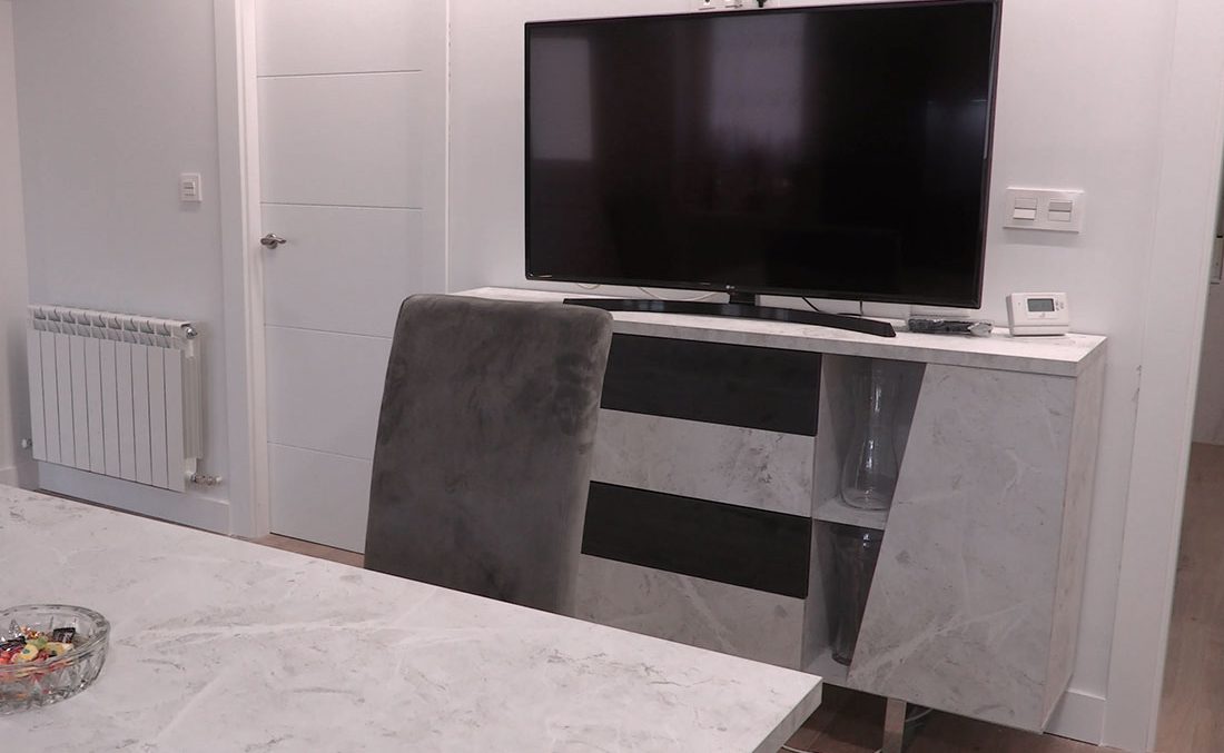 Por último, tenemos en el centro de la sala una mesa con capacidad para 6 personas, donde pueden comer juntos. En el mueble aparador cercano pueden colocar un televisor u otras decoraciones.